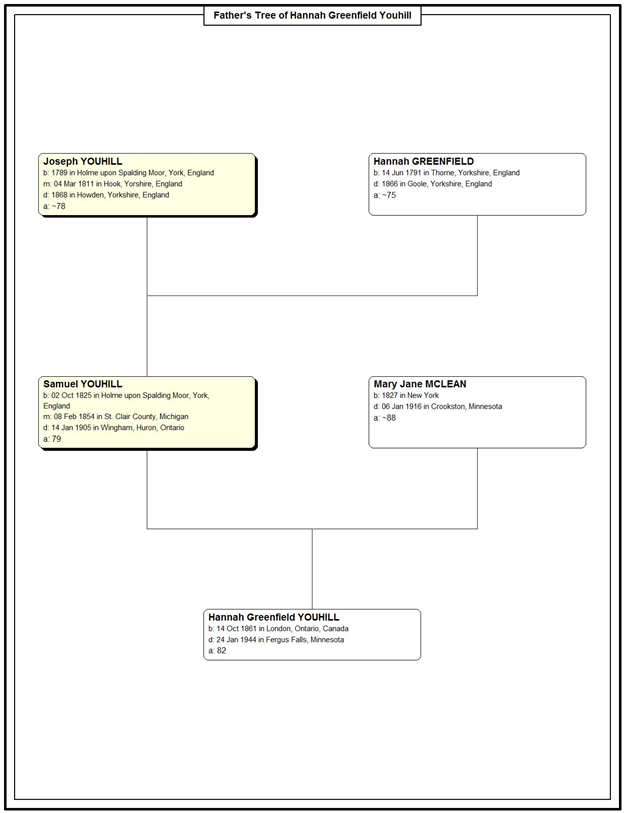 Hannah Greenfield Youhill was born on 14 Oct 1861 in London, Ontario, Canada, died on 24 Jan 1944 in Fergus Falls, Minnesota at age 82, and was buried in Oakdale Cemetery - Crookston, Minnesota.