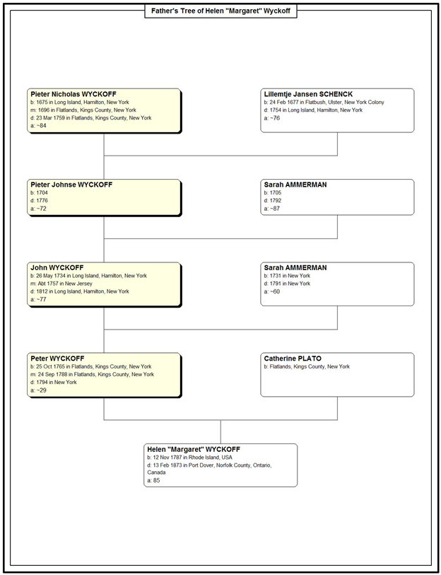 Helen "Margaret" Wyckoff was born on 12 Nov 1787 in Rhode Island, USA, died on 13 Feb 1873 in Port Dover, Norfolk County, Ontario, Canada at age 85, and was buried in St. Johns Church Cemetery, Norfolk County, Ontario, Canada.