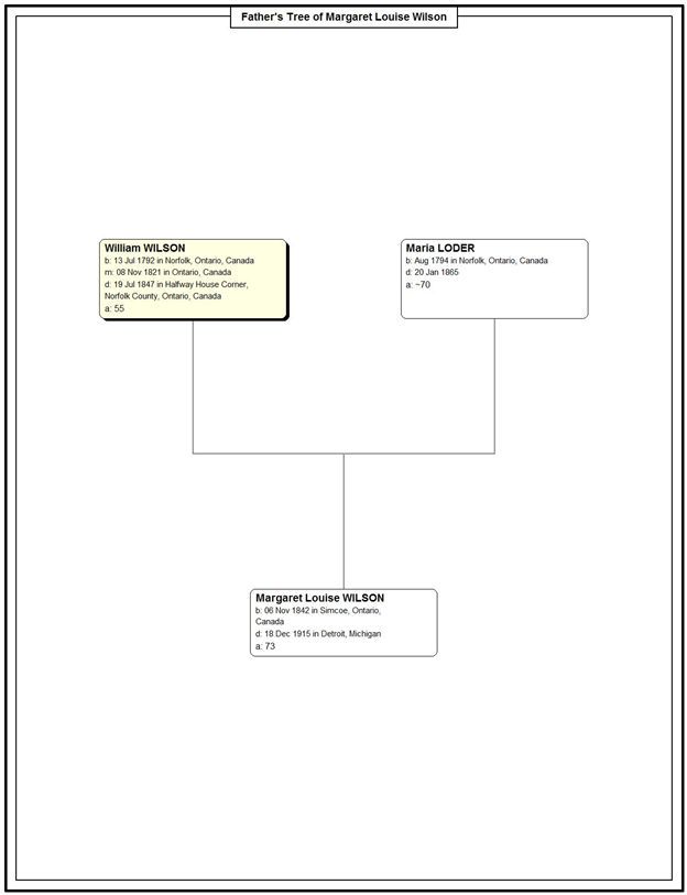 Margaret Louise Wilson was born on 6 Nov 1842 in Simcoe, Ontario, Canada, died on 18 Dec 1915 in Detroit, Michigan at age 73, and was buried in Simcoe, Ontario, Canada.
