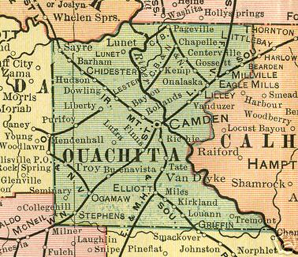 Family of Charles Potts resided in Magnolia, Arkansas. Note location of Ogamaw in neighboring Ouachita county (upper right) where Charles Potts' lumber business was located.